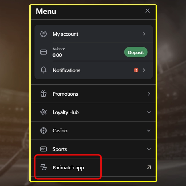 You just need to go to the Parimatch website and find the “Apps” option, download the official brand app and then install.